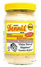 Dennis' Horseradish is a regional food item that is grown near Delhi, Ontario, Canada. The business has been in operation since 1960; selling their products at chain supermarkets in Ontario.[3] Western Canada has been seen as a "target" market for Dennis' Horseradish.[3] Currently, Dennis' Horseradish has been sold as far north as Lindsay, Ontario where it is a featured item at their farmers' market.[4]
