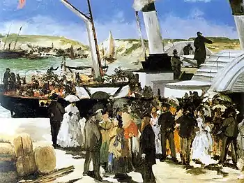 The Folkestone Boat, Boulogne or Departure of the Folkestone Steamer (French - Le Départ du vapeur de Folkestone) is an 1869 oil-on-canvas painting by Édouard Manet, produced during one of his regular summer stays at Boulogne-sur-Mer. It shows a dawn scene with the steamship which regularly sailed between Boulogne and Folkestone – Manet and his family had embarked on it the previous year en route to London and the woman in white on the far left of the work is Suzanne Manet, accompanied by their son Léon. It is now in the Philadelphia Museum of Art.[1]