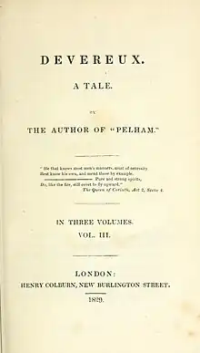 Devereux is an 1829 historical novel by the British writer Edward Bulwer-Lytton, published in three volumes. It takes place during the reign of Queen Anne and partly revolves around a secret Jacobite plot to place the pretender James Stuart on the throne. He earned £1,500 for the novel from his publisher Henry Colburn, trebling his earnings from the successful silver fork novel Pelham of the previous year.[1] He dedicated it to his friend the Canadian traveller and writer John Auldjo, then living in Naples. The story of a sibling rivalry between three brothers may have been influenced by Bulwer-Lytton's own upbringing.[2]