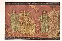 In the Dura Europos synagogue, the hand of God appears ten times, in five out of the twenty-nine biblically themed wall paintings including the Binding of Isaac, Moses and the Burning Bush, Exodus and Crossing of the Red Sea, Elijah Reviving the Child of the Widow of Zarepheth, and Ezekiel in the Valley of Dry Bones.[33] In several examples the hand includes the forearm as well.