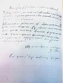 Letter sent to Stjepan Verković in September 1869, where the Zograf signed himself as Bulgarian painter.[11] From the letter is clear that he was asked to hand out manuscripts and old books that he could find in the churches. Verković, for his part, provided him with printed biographies of Saints.[12]