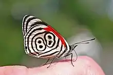 Diaethria anna, also known as Anna's eighty-eight or Finita Burrasca , is a butterfly in wet tropical forests in Middle America. On rare occasions, it can be found as a stray in south Texas. Its upperside is dark brown with a metallic bluish-green band on the forewings. The underside of the forewings are red, which is followed by a wide, black band and then white tips; the underside of the hindwings is white, with lines that approximate a black-outlined "88", giving the species its common name. Its markings occasionally appear more like of "98" or "89".