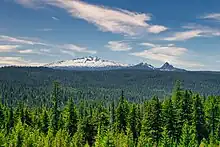 Diamond Peak forms part of the central arc of the Cascade Volcanoes,[20] and it joins several other volcanoes in the eastern segment of the Cascade Range known as the High Cascades.[21] Formed towards the end of the Pleistocene epoch, these mountains are underlain by more ancient volcanoes that subsided due to parallel north–south faulting in the surrounding region.[22] The High Cascades consist mostly of Pleistocene volcanoes constructed on top of upper Cenozoic lava flows and volcanic vents (produced within the last 15 million years), with compositions varying from homogenous, mafic lava flows (rich in magnesium and iron) and pyroclastic rocks to lava more enriched with basalt and rhyodacite.[21]