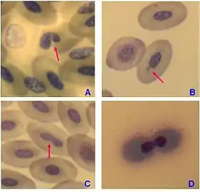 - 1 2 3 4 5 Anbumani, S.; Mohankumar, Mary N. (2015-08-12). "Nucleoplasmic bridges and tailed nuclei are signatures of radiation exposure in Oreochromis mossambicus using erythrocyte micronucleus cytome assay (EMNCA)". Environmental Science and Pollution Research. 22 (23): 18425–18436. doi:10.1007/s11356-015-5107-1. ISSN 0944-1344. PMID 26263884. S2CID 21454141.