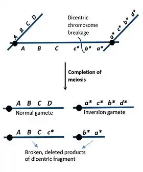 Most dicentric chromosomes are known to form through chromosomal inversions, which are rotations in regions of a chromosome due to chromosomal breakages or intra-chromosomal recombinations.[2] Inversions that exclude the centromere are known as paracentric inversions, which result in unbalanced gametes after meiosis.[2] During prophase of meiosis I, homologous chromosomes form an inversion loop and crossover occurs. If a paracentric inversion has occurred, one of the products will be acentric, while the other product will be dicentric.[1][2] The dicentric chromatid is pulled apart during anaphase of meiosis I with such force that the chromosome breaks at random positions.[2] These broken fragments result in deletions of genes that lead to genetically unbalanced gametes. This can have severe consequences, contributing to the development of genetic disorders such as Kabuki syndrome and Edwards syndrome.[2]