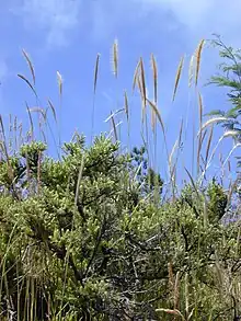 Dichelachne crinita , commonly known as the longhair plume grass, is a type of grass found in Australia, New Zealand and islands of the Pacific Ocean. It is often seen on sandy soils near the sea as well as woodlands. The flowering panicles are open and feathery at maturity. The grass may grow up to 1.5 metres (5 ft) tall. Crinita, the specific epithet, is derived from Latin (hairy).[1]