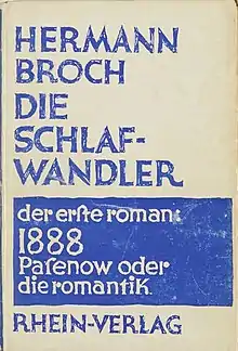 The Sleepwalkers (German: Die Schlafwandler) is a 1930s novel in three parts, by the Austrian novelist and essayist Hermann Broch. Opening in 1888, the first part is built around a young Prussian army officer; the second in 1903 around a Luxembourger bookkeeper; and the third in 1918 around an Alsatian wine dealer. Each is in a sense a sleepwalker, living between vanishing and emerging ethical systems just as the somnambulist exists in a state between sleeping and waking.[1] Together they present a panorama of German society and its progressive deterioration of values that culminated in defeat and collapse at the end of World War I.