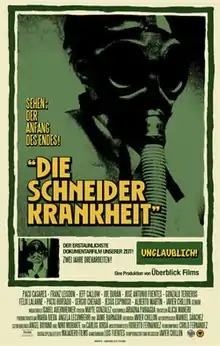 Die Schneider Krankheit (Spanish: El Mal de Schneider; English: The Schneider Disease, alternately Schneider's Disease) is a 2008 Spanish short science fiction mockumentary film written, directed, and produced by Javier Chillon,[1] with brief animated sequences by Alicia Manero. Chillon's first film was shot on black and white Super 8 film, with a Spanish-language voice-over dubbed over another German one.[2] With credits and most other onscreen text in German, the short film gives the impression of being a West German educational documentary film of the 1950s or 1960s.[3] Its subject is the effect of an extraterrestrial plague brought to Earth by a Soviet chimpanzee cosmonaut after its capsule crash landed near the border with East Germany in 1958. Financed entirely by Chillon himself,[4] the short film was selected for more than 200 international film festivals and received more than 45 awards within the first two years of its release,[1] including a Méliès d'Argent in 2010.