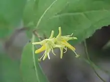 Northern bush honeysuckle is a deciduous shrub, reaching a maximum height between 0.6 and 1.2 metres (24 and 47 in).[1] This particular species is known for the following characteristics: branches lying close to the ground, fibrous roots, pale yellow flowers, and dry, woody fruit. Northern bush honeysuckle's simple leaves are placed in an opposite arrangement. As the seasons change, so do the leaves' colours: initially green, the leaf gradually deepens to a dark red.[2] The flowers are in full bloom between early July and early August; the woody seeds are fully matured by September in preparation for dispersal.