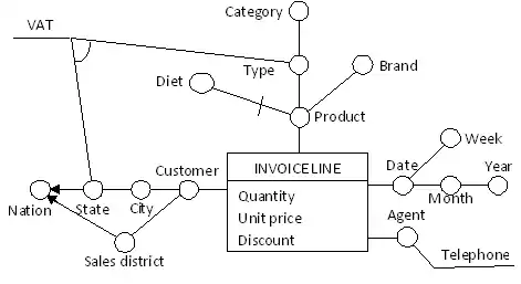 A fact is represented by a box that displays the fact name along with the measure names. Small circles represent the dimensions, which are linked to the fact by straight lines (see Figure 1).