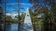 New Zealand artist David McCracken designed the sculpture to be constructed from welded aluminum. The dimensions of the structure are 12 metres (39 ft) x 1.45 metres (4.8 ft) x 3.8 metres (12 ft).[6] It is installed in Christchurch Botanic Gardens in Kiosk Lake. It is a stairway sculpture which is meant to be an optical illusion. The illusion is achieved due to wider steps at the bottom of the sculpture which gradually decrease in size with each step until they come to a vanishing point at the top.[1] The steps at the top are just a few centimeters wide.[7] When viewed from certain angles it appears to be an endless stairway.[2]