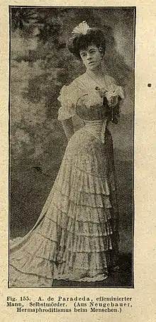 Between 1899 and 1900, Paradeda was already a prominent figure of Berlin urning balls.[4] During one of them in 1903, she met Magnus Hirschfeld, who later described the meeting several times in his writings.[5] He mentioned her wearing a Parisian red silk evening dress, with laces worth more than 2000 franks.[5] Paradeda frequented the local that Hirschfeld visited and was raising the interest of the local social circles, so Hirschfeld started the conversation with her.[5]