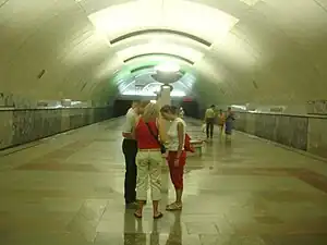 Dinamo (Russian: Динамо) is a station of the Yekaterinburg Metro which was opened on December 22, 1994. It is located between stations Uralskaya and Ploshchad 1905 Goda. Dinamo stadium and the "Uralochka" Palace of Sporting Games are near the metro station.