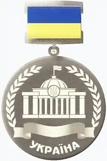 The Diploma of the Verkhovna Rada of Ukraine is an award of the Verkhovna Rada of Ukraine[1][2] for significant contribution to any sphere of state life, outstanding socio-political activity, merits to the Ukrainian people[3] in promoting and strengthening Ukraine as a democratic, social, legal state, implementation of rights and freedoms of citizens, development of democracy, parliamentarism and civil harmony in society, and finally, active participation in legislative activities.