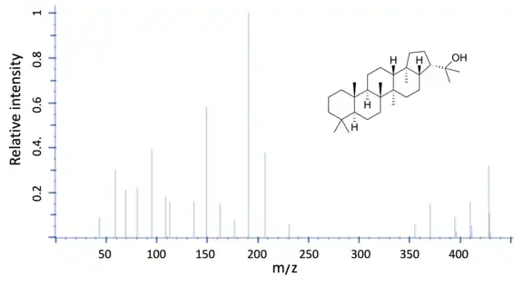 A positive identification is often obtained by comparison with extracts from known bacterial producers of diplopterol, such as Methylococcus capsulatus.[10] A literature mass spectrum for diplopterol is shown, along with a figure from a recent report which examines several hopanoid biomarkers in lipid extracts from Rhodopseudomonas palustris.[10]