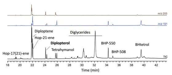 Lipid compounds like hopanoids serve as extremely useful biomarkers for ancient life as they are both diverse and extremely well preserved in sedimentary rocks.[3] Because diplopterol is so widespread in bacteria, it is not particularly useful for identification of specific organisms in a given sample. However it is quite useful for determining the relative oxygen content of a region at the time of deposition.[11] For example, diplopterol has been used to examine methane oxidation in sediments because it is produced by aerobic methanotrophic bacteria.The property which is most often used to characterize diplopterol in sediments is the 13C depletion, denoted as δ13C. This isotopic signature is impacted by a variety of factors including burial rates, nutrients, and metabolism.[12] For example, diplopterol δ13C values have been used to determine both the oxygenic conditions of diplopterol biosynthesis and temperatures during sediment deposition.[6]
