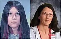 Pamela Sue "Pam" Hobley was fifteen and was born on May 24, 1954.[5][12][13] Her hair and eyes were brown, and she was between 5 feet 6 inches and 5 feet 8 inches tall and weighed about 110 to 115 pounds.[6] She had "distinctive marks," namely two scars, one near her nose and the other by her mouth, although some sources state the latter was a birthmark.[13] Hobley wore a white imitation fur coat edged with brown, a plaid skirt, a shirt of an unspecified color, high-heeled shoes, and white socks.[2] It is known that Hobley had been engaged in activities of which her family did not approve. Rumors also have circulated that she, along with Spencer, may have "experimented with drugs and alcohol."[14] Hobley had apparently accepted a marriage proposal prior to her disappearance.[12]