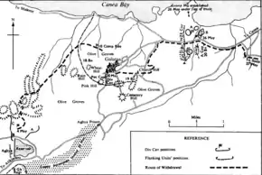The brigade was strafed by German aircraft on the morning of 21 May. The 19th Battalion (supported by C Squadron and light tanks from the 3rd Hussars) assaulted Cemetery Hill, where two German machine guns threatened A and C Squadrons and part of the battalion. Although the Germans were driven off, the battalion could not hold under heavy mortar fire and withdrew; Cemetery Hill became a no man's land. On 25 May, heavy German attacks drove British forces from Wheat Hill and exposed the centre of the 18th Battalion, which withdrew through Galatas.[33] The right flank of Div Cav and the Petrol Company, acting as infantry, was exposed and the 23rd Battalion counter-attacked and retook Galatas at dusk, withdrawing during the night. That night Div Cav retreated to Church Hill, behind the 19th Battalion. At 01:00 on 26 May the regiment joined remnants of the 21st Battalion commanded by Lieutenant Colonel Allen on the main coast road between Chania and Galatas on Hellfire Hill.[34]