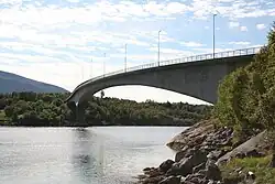 The Djupfjordstraumen Bridge (Norwegian: Djupfjordstraumen bru, also known as Djupfjordbrua) is a cantilever road bridge that crosses the Djupfjorden in Sortland Municipality in Nordland county, Norway. The bridge is 346 metres (1,135 ft) long and the main span stretches 190 metres (620 ft). The bridge was opened in 1983. It is located on the west coast of the island of Hinnøya.[1][2]