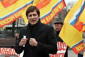 Dmitry Gennadyevich Gudkov (Russian: Дмитрий Геннадьевич Гудков; born 19 January 1980)[1] is a Russian politician and opposition leader.[2] He was elected as a member of the State Duma in 2011–2016.[3] His father, Gennady Gudkov, was also a Duma deputy in 2001–2012. Both father and son were members of the party A Just Russia.[4] Gudkov was expelled from the party on 13 March 2013 after it accused him of "calling on the American authorities to interfere in Russia’s internal affairs".[5][6] While Gudkov ran as candidate of Yabloko party[7][8] and worked with the non-systemic opposition, he lost in the 18 September 2016 election for the Russian Parliament.[9] In 2018, he and Ksenia Sobchak decided to align together, which lead to the creation of an opposition political party which is called the Party of Changes.[10]