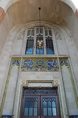 Above the main entrance is the phrase, "The half of knowledge is to know where to find knowledge."[2] Inside the lobby is a painted ceiling and a large mural donated by the Class of 1949, "The University, Sunrise to Sunset" by Artemis Housewright, an FSU alumna. The artwork depicts school history as well as local fauna and flora.[2]