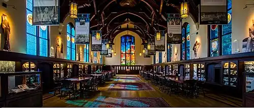 The Werkmeister Humanities Reading Room opened in 1991 as a quiet place for student study in Dodd Hall's west wing. It was named for Professor William H. Werkmeister and his wife, Dr. Lucyle T. Werkmeister in the Department of Philosophy.[3] The professor was one of the nation's foremost authorities in the field of philosophy and authored the book, "History of Philosophical Ideas in America", printed in 1949.[4] Department lectures and symposia were often held in Werkmeister.[2] On October 31, 1997, the Werkmeister Window was unveiled and dedicated.[2] The design was by Professor Emeritus Ivan Johnson, crafted by Bob and JoAnn Bischoff, and depicts four well-known FSU buildings.[3] The window took a decade to build and is composed of over 10,000 glass pieces. It stands 22 feet tall, ten feet wide, and completed the first phase of renovation.[2]
