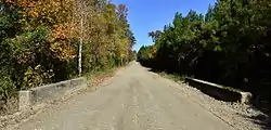 The roadway was paved in 9 feet (2.7 m) wide concrete slabs, poured in a 1-2½-5 mixture.[3] The concrete was topped with a layer of coal tar about 1/16 inch thick.[4] At the edges were 45 degree slopes, which means only 8.5 feet (2.6 m) of the width was level, with the slopes acting as curbs. Further out from the center was 18 inches (0.46 m) of gravel and 3 feet (0.91 m) of earthwork. The gravel shoulder allowed vehicles to continue on the road without stopping for oncoming traffic, which was common at the time.