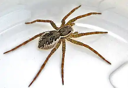 This species is one of four species of Dolomedes found in New Zealand, and grows up to 7 cm across, including legs.[3][5] It has yellow stripes down its cephalothroax, which is dark orange-brown where D. aquaticus is grey.[3] It has distinctive features of the male pedipalps and female genitalia, but can easily be distinguished from other Dolomedes species by the stripes down each side of the abdomen, which are light yellow-brown with several patches extending a little way towards the midline.[1] Body length is 12–18 mm in males, 18–25 mm in females.[1] Because they weigh less than a gram and are covered with hydrophobic hairs, these spiders can walk on the water surface without sinking.[3]