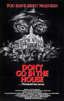 Don't Go in the House[lower-roman 1] is a 1980 American horror film written and directed by Joseph Ellison, written by Ellen Hammill and Joe Masefield, and starring Dan Grimaldi. Its plot follows a disturbed man who, after suffering an abusive childhood in which his mother punished him with burning, becomes a pyromaniac and serial killer who kidnaps and burns alive any women who resemble her.
