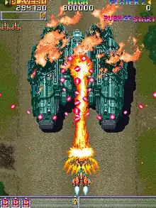 DonPachi features a scoring system known as the "Get Point System" (GPS).[1] By destroying large groups or chains of enemies in a short period of time, the player can build up a number called a combo, similar to the kind found in fighting games. They receive an increasing number of points with every enemy they shoot down; the more enemies the player hits in one chain, the more points they receive. They can break the chain by waiting to shoot an enemy; the combo number will turn blue when the player's chain is broken. This system brings a new challenge after the player has cleared the game; plot out the stages to achieve a high score. The player flies their selected fighter over 5 areas of various terrain, encountering a number of land, sea and air enemies. The player's ship has two modes of fire: by tapping the fire button, shots are fired; holding it down produces a concentrated vertical beam, but also reduces the ship's speed.