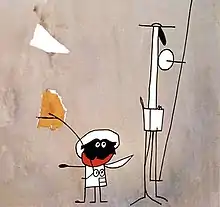 The author reduced the characters in the short to Klee-style ideograms, with backgrounds being represented by abstract frescoes,[1] all of which is accompanied by atonal music.[2] The short was blacklisted during the former Yugoslavia due to its rigid classification of art and society, which Don Kihot challenged.[1] The short won a number of prizes at international festivals, such as the main prize at International Short Film Festival Oberhausen in 1962.[1] It is described as a "difficult but very poetic film" and a magnum opus for Kristl.[3] Speed and Wilsom state that the short "presents the eccentric individualist assailed by all the forces of the modern state - guns, radar, tanks, planes, patrols, armies - and in some amazing way the nonconformist deviationist Don triumphs over them all".[4]