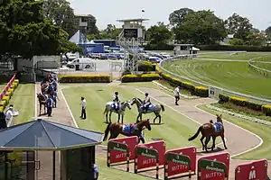 Doomben racecourse is currently owned and operated by the Brisbane Racing Club (BRC), an entity which also owns and operates the neighbouring racecourse – Eagle Farm – which together, serve as the two most prominent Racecourses in South East Queensland.[11] The BRC has operated within and between these two courses since the club's establishment in 2009, following a merger between two clubs; the Queensland Turf Club (QTC) and the Brisbane Turf Club (BTC). The QTC, prior to the merger, had operated out of Eagle Farm Racecourse since the club's first race meeting in August 1865, with the BTC operating solely from Doomben racecourse. Although the BTC has conducted race meetings at Doomben since the course's opening and inaugural race in 1933, the BTC was formally known as the Brisbane Amateur Turf Club (BATC) which was the club that the Doomben course officially opened under. This change in club name from BATC to BTC, occurred in 1997 and remained up until the 2009 merger.[3]