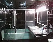 Today, the main floor is occupied by two businesses, a bar and restaurant known as the "Windbag Saloon and Grill", and the adjacent "Ghost Art Gallery", which has its framing shop on the second floor, in the area that once included the main entrance, a large sitting room, and Dorothy's personal residence.[3] Most of the remaining upstairs rooms have been converted to office space,[4] but one room has been kept precisely as it was at the time of the police raid in 1973; her bathroom—which has an unusual black-and turquoise green decor, cutout starbursts in the dropped ceiling, and an oversized bathtub.[3] There are numerous reports that the building is haunted.[9]
