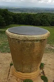 On the top of the hill is a trig point, and also a toposcope illustrating many of the landmarks that are visible from it. These include the Black Mountains in South Wales and the Long Mynd in Shropshire (nearly 60 miles (97 km) away).[1]