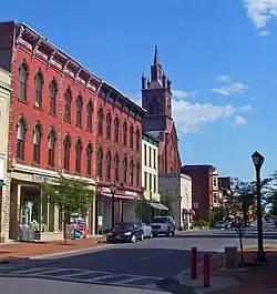 - St. Bernard's Roman Catholic Church, 107 Ontario Street. Large brick Romanesque church, built in the 1860s, has an enclosed garden. Originally had a 200-foot (61 m) spire that collapsed during an 1875 storm.[1]