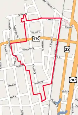 The district is bounded by Oneida Street on the north and the former Delaware and Hudson Railroad (now CP Rail) tracks on the east. On the west it takes the form of an irregular diagonal beginning at the intersection of Columbia and Remsen streets at the southeast, cutting through the middle of several blocks, and ending at Ontario and Olmstead streets in the northeast.[1]