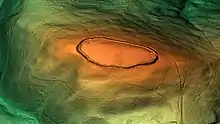 The fort has an oval shape, with a single rampart and ditch (univallate) following the contours of the hill top, enclosing an area of 6¾ acres (2.7 hectares).[4] The main entrance is to the east, towards Nether Stowey, with a simpler opening to the north-west, aligned with a ridgeway leading down to Holford. The Lady's Fountain springs are in the combe to the west. A col to the south connects the hill to the main Stowey ridge, where a linear earthwork known as Dead Woman's Ditch cuts across the spur. This additional rampart would have provided an extra line of defence against attack from the main Quantock ridge to the west, and it could have been a tribal boundary.