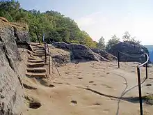 Drábské světničky is a ruin of a 13th-century rock castle in the Czech Republic. It is located about 4 kilometres (2.5 mi) northeast of Mnichovo Hradiště on the ragged edge of a sandstone cliff high above surrounding landscape. The castle covers a group of seven sandstone rocks, connected with wooden bridges. It has been abandoned since the Hussite wars in the 15th century.
