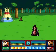 The plot is told through cinematics by Gohan and other characters to Goten, whose father died prior to his birth and players have the choice to select any of the stories and face the enemy.[2][3][4] Fights in the game are split into two formats: a Street Fighter II-esque format using a four-tier battle plane reminiscent of Fatal Fury where players must charge a energy bar to activate a special attack against the opponent during another gameplay segment, where players choose the attack to perform.[3][4] During the fighting segment, players can perform actions such as block incoming attacks and shoot a projectile.[4]