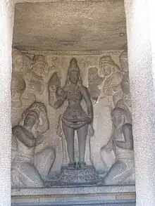 Resembling a chariot (ratha), it is carved out of a single, long stone of granite.[3][4][5] Though sometimes mistakenly referred to as a temple, the structure was not consecrated because it was not completed[6] due to the death of Narasimhavarman I.[4][5][7] The structure is named after the common consort Draupadi of the Pancha Pandavas, of epic Mahabharata fame,[3][5][8] though the nomenclature is not supported by history.[4] The unfinished structure is dedicated to the goddess Durga.[9]