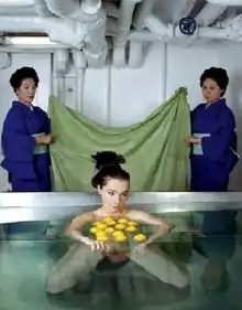 As the small vessels ferrying the Occidental Guests pull up to the ship, an activity on deck is shown in which a man with two large stamps, in the style of a Japanese calligraphic seal, repetitively and rhythmically inks the instruments and imprints large rectangles of canvas. The Female Guest is led to descending stairs in the deck. She looks out over the prow of the vessel and finds her way down into the labyrinthine bowels of the ship. Occasionally she comes across small rocks on the corridor floor wrapped with red twine, which she appears to intuitively interpret as warning markers to prevent her from losing her way. Her path eventually takes her to a room with a large, metal, cubic bath where two Japanese women in blue serving garb, amah, attend to her. They pour a basket of lemons that have had a central strip excised into the water and remove the Guest's clothing before she steps into the bath. The Male Guest is lifted to the ship's deck in a large, winched basket and led to the same descending stairs. He searches for the correct door and arrives at the ship's barber, who carefully shaves off the entirety of Guest's substantial beard with a straight-razor. The petroleum jelly in the field-mould starts to solidify on deck. The Male Guest, shorn and dressed in denim, is guided by twine-wrapped rocks to a room separated by a large antique screen on which a traditional fishing scene is painted.