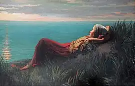 The painting shows a young girl resting with her back on a sand dune and her hands behind her head. She looks toward the sea with the setting Sun casting rays on the waves.[1]
