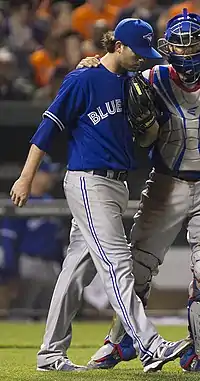 On March 31, 2015, Hutchison was named the Opening Day starter for the Blue Jays, and became the youngest Opening Day starter in franchise history.[17][18] After taking the win on Opening Day, Hutchison struggled in his next two starts. On April 23, he took a perfect game into the 6th inning against the Baltimore Orioles. He finished the day with 8 innings pitched, and yielded 2 runs on 4 hits, while striking out 8, as the Blue Jays won 7–6.[19] On May 25, Hutchison pitched his second career complete game shutout, defeating the Chicago White Sox 6–0. He needed only 96 pitches to complete the game, yielding 4 hits and striking out 8.[20] He would struggle with his command from that point onward, posting an ERA above 5 into August. After earning his 12th win of the season on August 16, Hutchison was optioned to Triple-A Buffalo, as the Blue Jays did not need a fifth starter until August 29.[21] Hutchison received the most run support in the American league leading him to record 12 wins in 28 starts despite posting an ERA of 5.57.