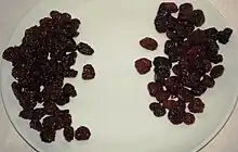 One method for industrial production of dried cherries involves first dipping them in a boiling 0.5–2% solution of sodium carbonate (NaCO3) for up to 20 seconds, and then rinsing in cool water; this induces small cracks in the skin and speeds up the drying process. Some other possible materials for the dipping solution include ethyl oleate and oleyl alcohol; adding alkalis like potassium carbonate (K2CO3) to such a dip was shown to have no positive effect on drying time. Such results had already been demonstrated in scientific research by the 1940s.[1] Dried cherries might also be produced by freeze drying or air drying.[2] After drying, they typically have a moisture content of around 25%.[1] Adding sulfur dioxide (SO2) may help to improve color and flavour retention over long periods of storage.[3]