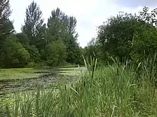 Much of Drinkwater Park is very flat as it is on the flood-plain of the River Irwell but the valley rises steeply to the east in the area known as Carr Clough. There is a long narrow reservoir running up the centre of the park which, on the 1894 map, appears to have been used as a water supply for the Clough Bleach and Dye Works,[2] although the narrow northern arm has long since been culverted. Most of the land in the park was very open and windswept until the early 1990s, as can be seen on the 1982 photograph by John Davies.[3] Since that time there has been a programme of tree planting carried out as part of the Red Rose Forest Scheme.[4] Most of the park, apart from the football playing fields, is now thickly wooded with a diverse selection of broadleaved trees.