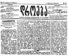The paper was published by S. Melikishvili from 1866 to 1882 and then by Giorgi Kartvelishvili from 1882 to 1885. At various times, it was edited by leading Georgian intellectuals, including Ilia Chavchavadze and Ivane Machabeli. The newspaper, in which most major Georgian writers, journalists and social activists of that time were published, was an energetic promoter of the Georgian national idea. The younger radical Georgian literati used the pages of droeba to introduce their readers to the ideas of progressive liberal thinkers like John Stuart Mill and "utopian socialists" like Robert Owen, Saint-Simon, Charles Fourier, Pierre Proudhon, and Louis Blanc.[2] Thus, it became more closely associated with the new generation of the Georgian national movement, known as meore dasi ("the second group") and led by Niko Nikoladze, which sought widely for a program of various forms of capitalism and Westernization.[2] The division of the Georgian intellectuals over the issues related to financial and economical projects was also reflected on the pages of droeba. This was one reason for Ilia Chavchavadze to leave the editorial board of droeba and found his own newspaper iveria.[3] The newspaper was closed on the order of the Russian viceroy Alexander Dondukov-Korsakov on September 16, 1885.[4]