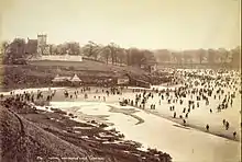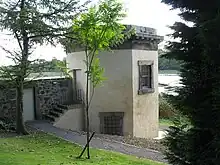 The loch was also important in the development of the sport of Curling.[1] Duddingston Curling Society was constituted on 24 January 1795, but with records of curling on the loch dating from at least 1761. Thomson's Tower, designed by William Henry Playfair in 1824, served the society and still stands on the north side of the loch. The Society was wound up after the winter of 1854/55 when the remaining members merged with the Coates Curling Club. A new Duddungston Curling Society was created from 1894/95.[6]
