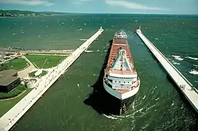 In its current configuration, the canal is defined by a pair of breakwaters 1,720 feet (520 m) long and 300 feet (91 m) apart, constructed of concrete set on timber and stone cribbing.[1] The canal is maintained at 245 feet (75 m) wide and 28 feet (8.5 m) LWD, allowing passage of ocean-going ships.[2] Three lighthouses are placed on the sides of the canal: the Duluth North Pier Light and the Duluth South Breakwater Outer Light mark the lake ends of the canal, while the Duluth South Breakwater Inner Light functions with the south breakwater light as a range light. At the harbor end, the canal is straddled by the Aerial Lift Bridge which connects Minnesota Point to the rest of the city. On the north side, there is a building housing the local Corps of Engineers administration, as well as the Lake Superior Maritime Visitor Center. There are no locks; most ships transit the canal under their own power, though tug service is available in case of adverse weather.[3] Around a thousand vessels a year ship from the Duluth–Superior port.[4]