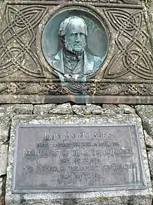 Duncan McLaren was married three times – the third being Priscilla Bright (sister of John Bright and Margaret Bright Lucas), whom he married in 1848, and they lived together in Newington House, Edinburgh, from 1852 until his death in 1886. He is buried (together with most of his family) in St Cuthbert's Churchyard in the heart of Edinburgh. His huge monument lies against the east wall of the first south extension to the graveyard, immediately below Edinburgh Castle.