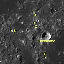 By convention these features are identified on lunar maps by placing the letter on the side of the crater midpoint that is closest to Dunthorne.